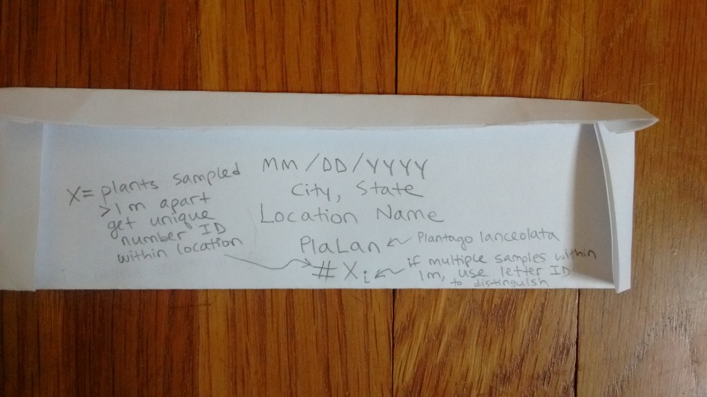 - If there are multiple plants in the population, please collect just one leaf per plant. The plants should be at least 1 m from each other. Label the envelopes with a unique number for each plant (e.g., #1, #2, #3…).