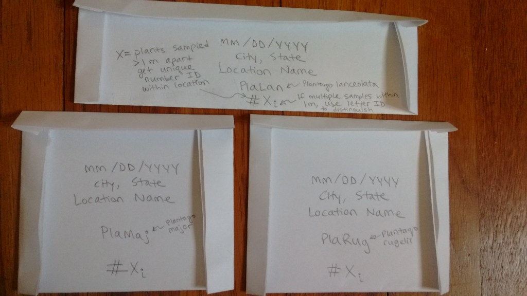 We are always grateful for help collecting seeds and leaf samples of Plantago lanceolata, P. major, or P. rugelii. We’ll use seeds in greenhouse experiments, and we’ll perform genetic and chemical analyses on leaf tissue. Please only collect samples from sites where you have permission (not from nature reserves or other protected areas).